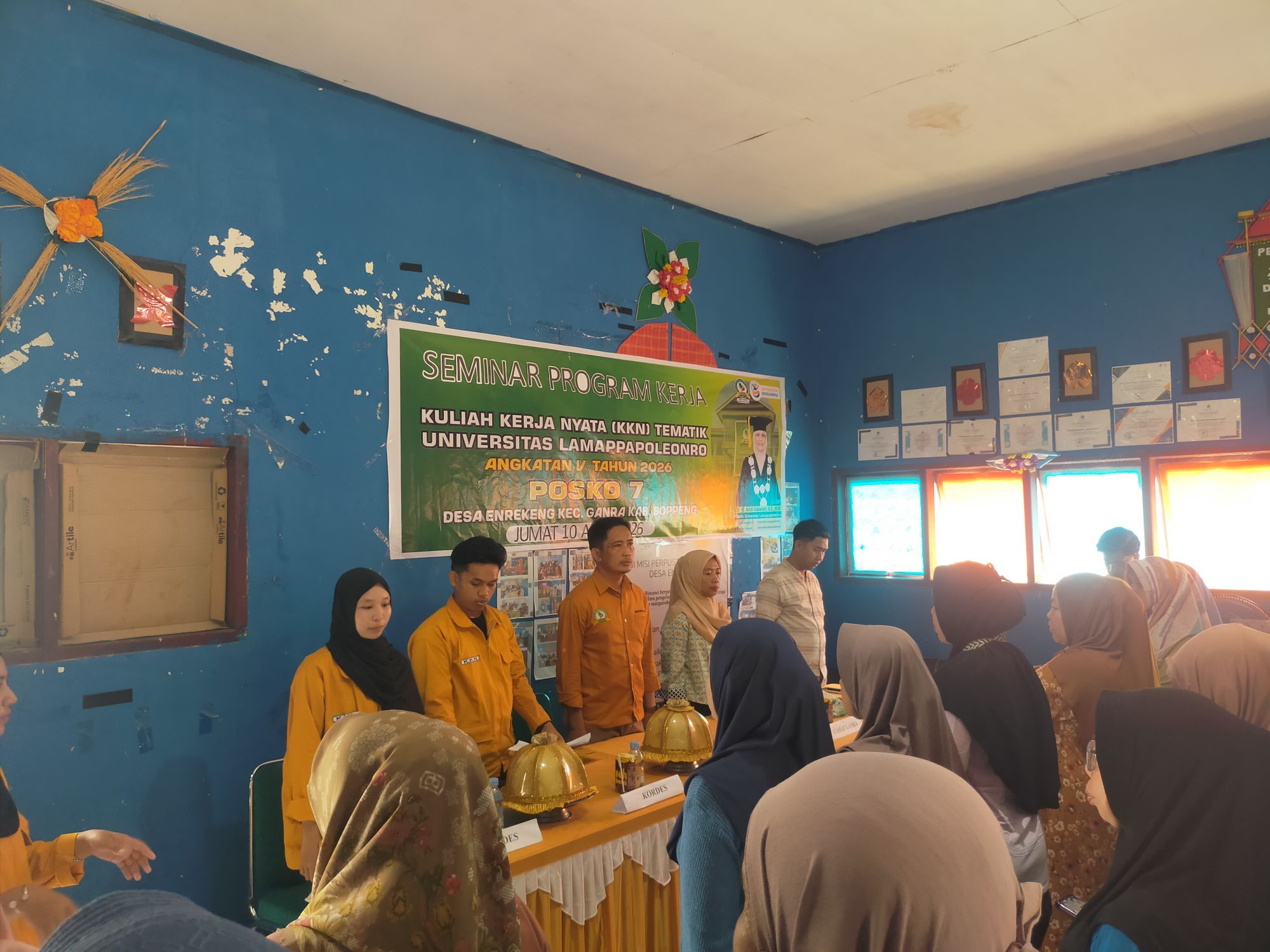 *SOPPENG* — Mahasiswa Kuliah Kerja Nyata (KKN) Universitas Lamappapoleonro Angkatan V Posko 7 resmi menggelar Seminar Program Kerja di Desa Enrekeng, Kecamatan Ganra, Kabupaten Soppeng, Kamis (10/4/2026).
